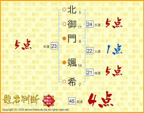 北(5画)御(11画)門(8画) 颯(14画)希(7画)