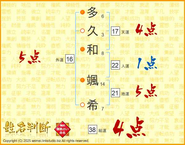 多(6画)久(3画)和(8画) 颯(14画)希(7画)