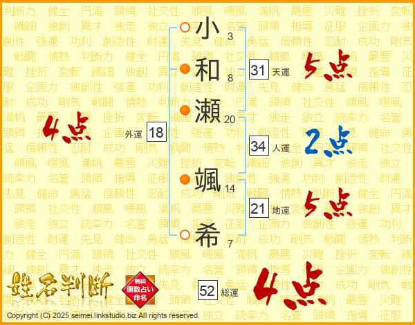 小(3画)和(8画)瀬(20画) 颯(14画)希(7画)