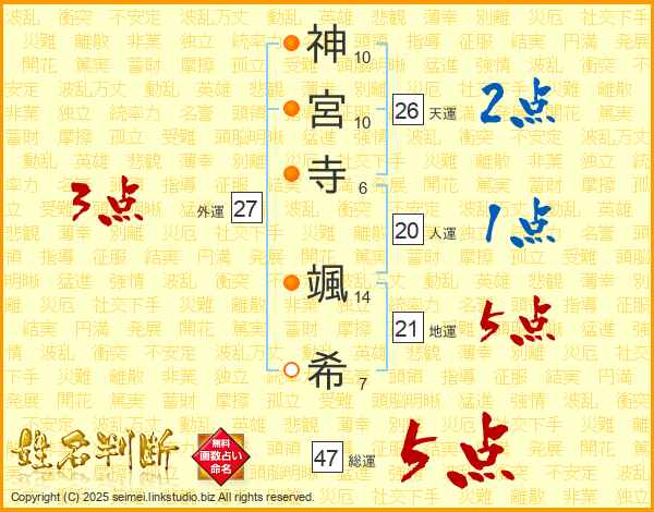 神(10画)宮(10画)寺(6画) 颯(14画)希(7画)