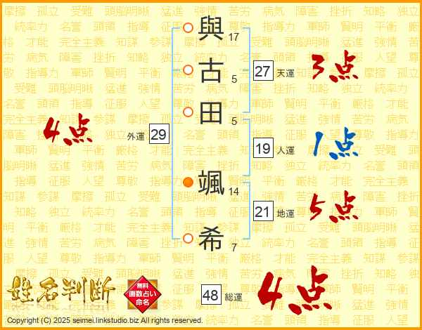 與(17画)古(5画)田(5画) 颯(14画)希(7画)