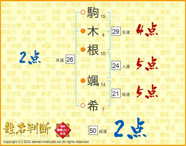 駒(15画)木(4画)根(10画) 颯(14画)希(7画)