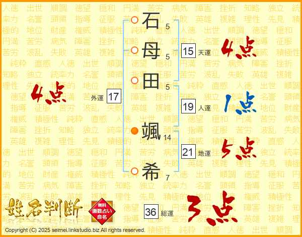 石(5画)母(5画)田(5画) 颯(14画)希(7画)