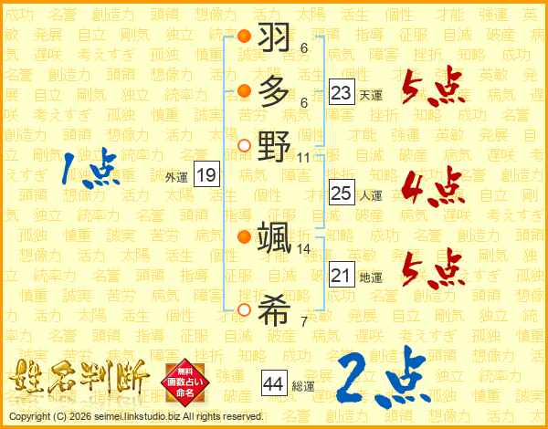 羽(6画)多(6画)野(11画) 颯(14画)希(7画)