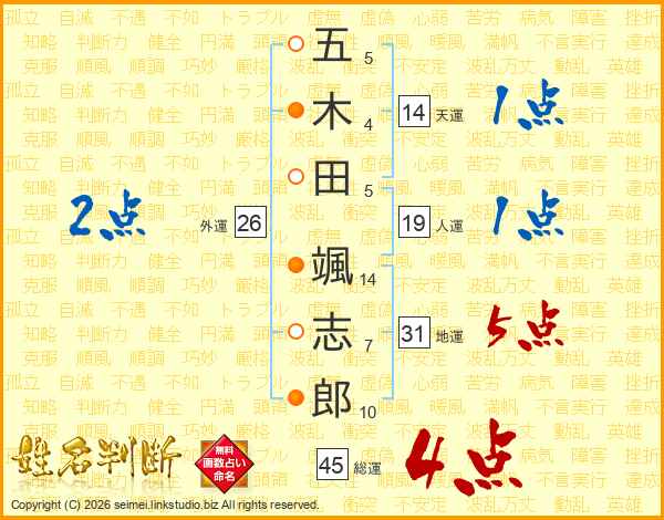 五(5画)木(4画)田(5画) 颯(14画)志(7画)郎(10画)