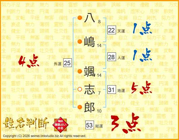 八(8画)嶋(14画) 颯(14画)志(7画)郎(10画)