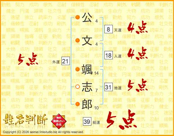 公(4画)文(4画) 颯(14画)志(7画)郎(10画)