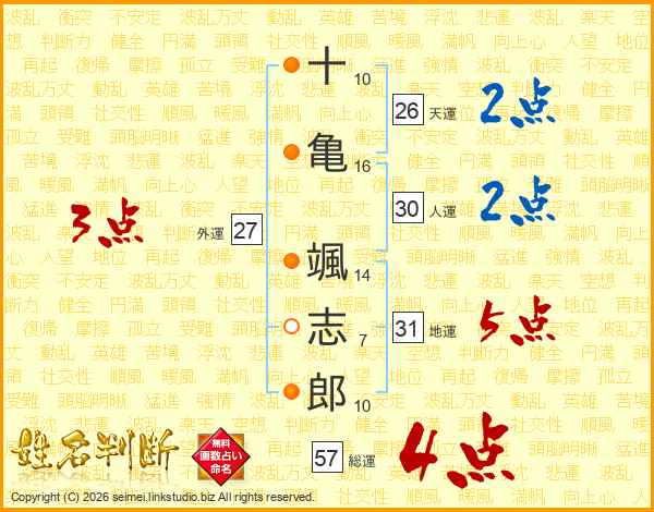 十(10画)亀(16画) 颯(14画)志(7画)郎(10画)