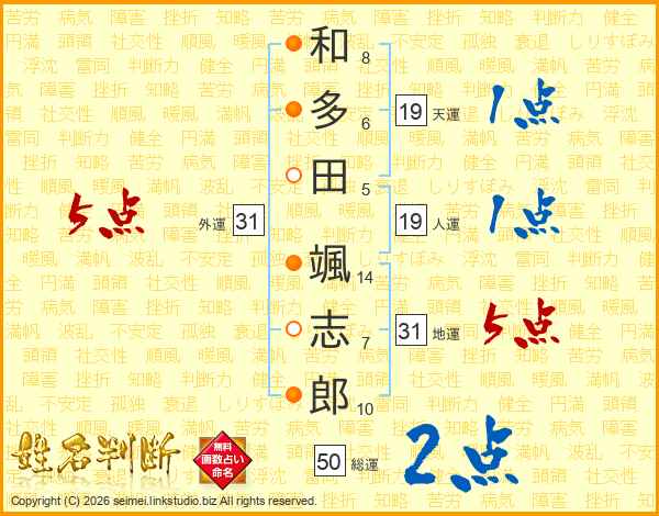 和(8画)多(6画)田(5画) 颯(14画)志(7画)郎(10画)