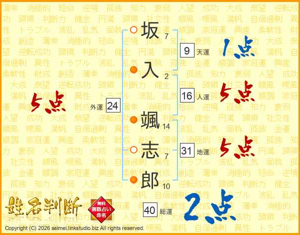 坂(7画)入(2画) 颯(14画)志(7画)郎(10画)