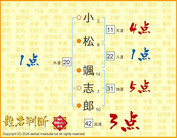 小(3画)松(8画) 颯(14画)志(7画)郎(10画)