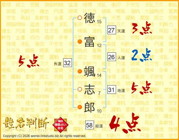 徳(15画)富(12画) 颯(14画)志(7画)郎(10画)