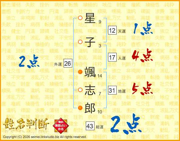 星(9画)子(3画) 颯(14画)志(7画)郎(10画)