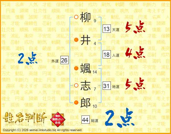 柳(9画)井(4画) 颯(14画)志(7画)郎(10画)