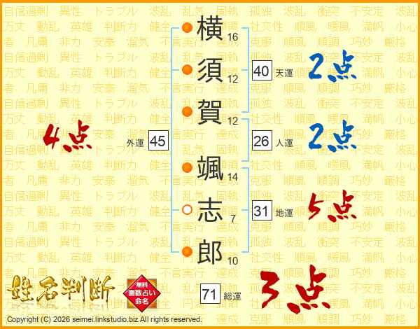 横(16画)須(12画)賀(12画) 颯(14画)志(7画)郎(10画)