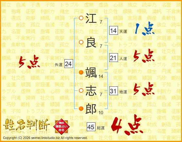 江(7画)良(7画) 颯(14画)志(7画)郎(10画)