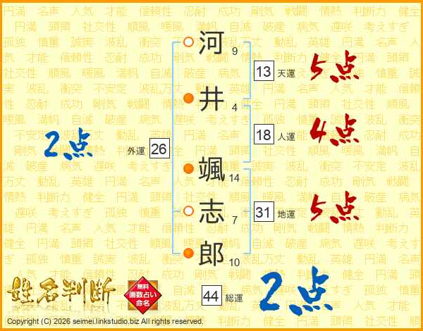 河(9画)井(4画) 颯(14画)志(7画)郎(10画)