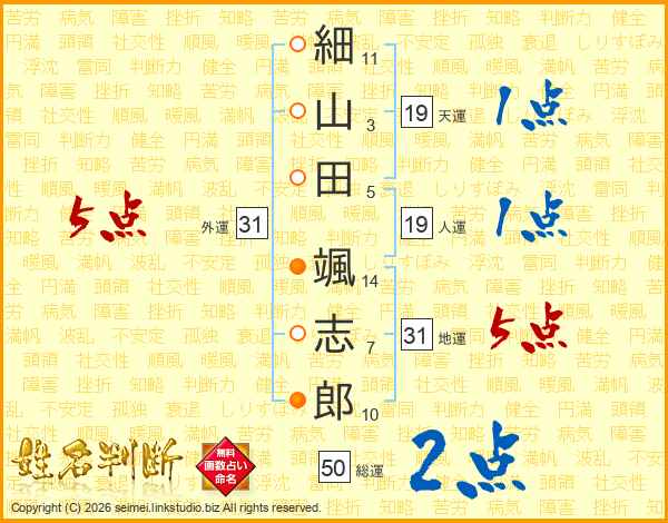 細(11画)山(3画)田(5画) 颯(14画)志(7画)郎(10画)