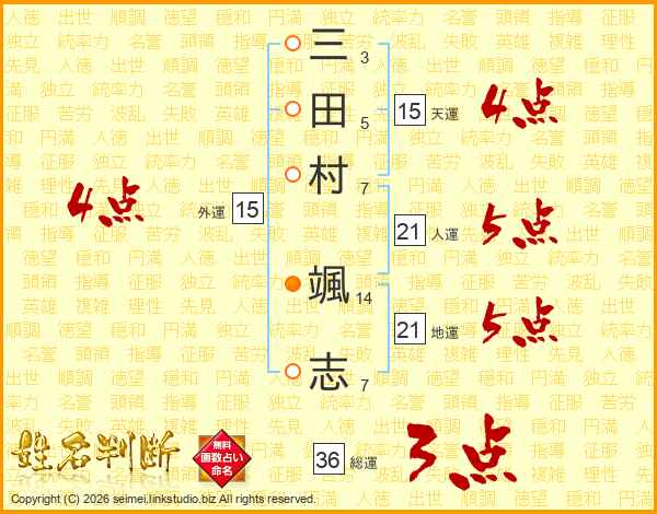三(3画)田(5画)村(7画) 颯(14画)志(7画)
