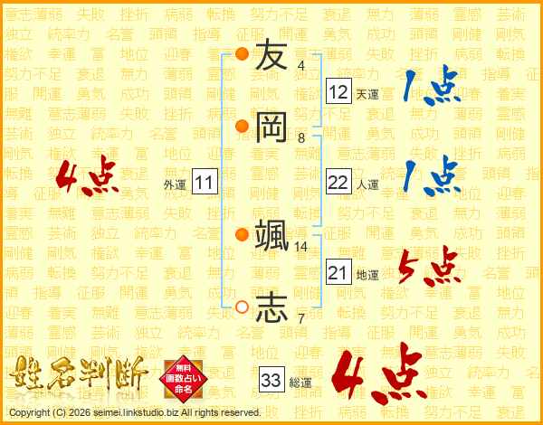 生活面を象徴する運勢です。外部から受ける影響力を表し、結婚運、家庭運や職場、環境への順応性を表します。総運から人運を引いた画数。姓や名が1文字の場合を除く。