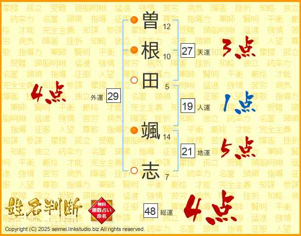 曽(12画)根(10画)田(5画) 颯(14画)志(7画)
