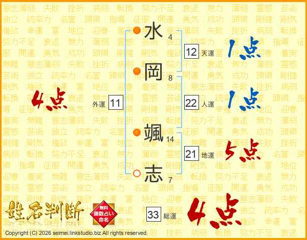 水(4画)岡(8画) 颯(14画)志(7画)