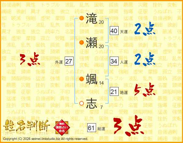 滝瀬颯志さんの総運は61画の3点!