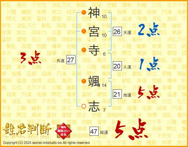 神(10画)宮(10画)寺(6画) 颯(14画)志(7画)