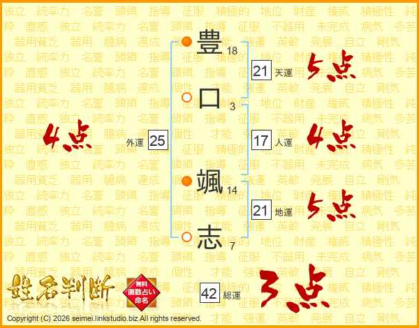 家系が持つ宿命的な運勢を表します。祖先から受け継いだ苗字ですので自分の力が及びません。家柄を象徴します。苗字の合計画数。