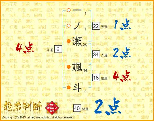 一(1画)ノ(1画)瀬(20画) 颯(14画)斗(4画)