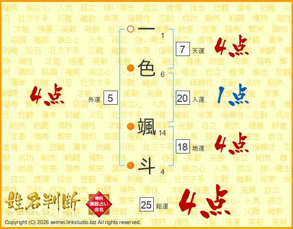 生活面を象徴する運勢です。外部から受ける影響力を表し、結婚運、家庭運や職場、環境への順応性を表します。総運から人運を引いた画数。姓や名が1文字の場合を除く。