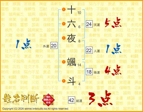 生活面を象徴する運勢です。外部から受ける影響力を表し、結婚運、家庭運や職場、環境への順応性を表します。総運から人運を引いた画数。姓や名が1文字の場合を除く。