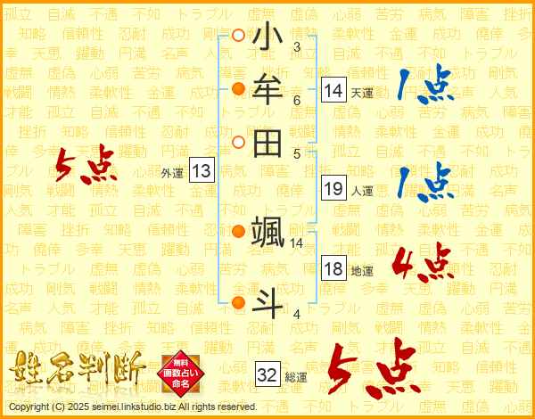 小(3画)牟(6画)田(5画) 颯(14画)斗(4画)