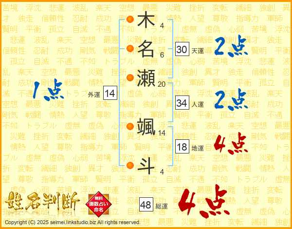 木(4画)名(6画)瀬(20画) 颯(14画)斗(4画)