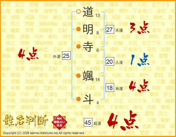 道(13画)明(8画)寺(6画) 颯(14画)斗(4画)
