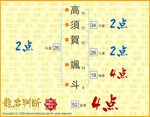 高(10画)須(12画)賀(12画) 颯(14画)斗(4画)