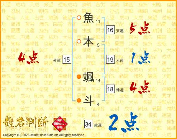 魚(11画)本(5画) 颯(14画)斗(4画)