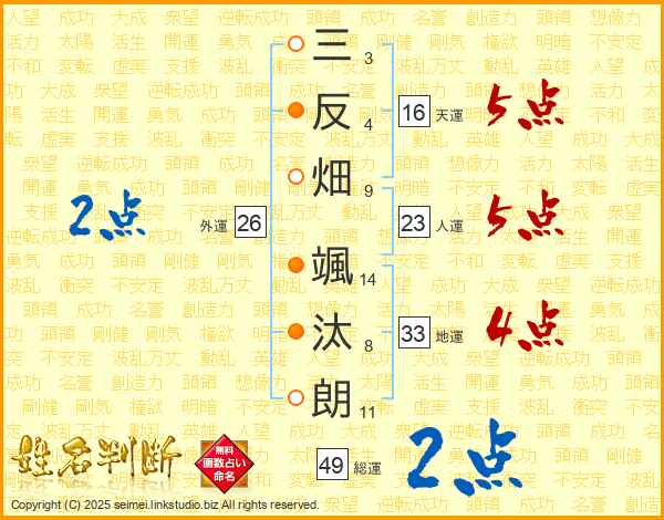 三(3画)反(4画)畑(9画) 颯(14画)汰(8画)朗(11画)