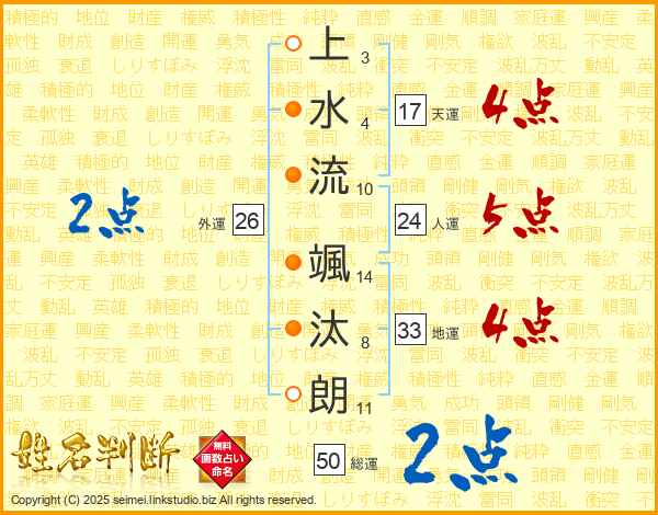 上(3画)水(4画)流(10画) 颯(14画)汰(8画)朗(11画)