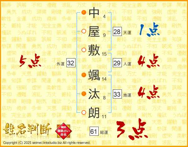 中(4画)屋(9画)敷(15画) 颯(14画)汰(8画)朗(11画)