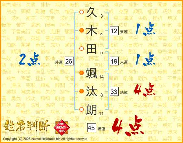 久(3画)木(4画)田(5画) 颯(14画)汰(8画)朗(11画)
