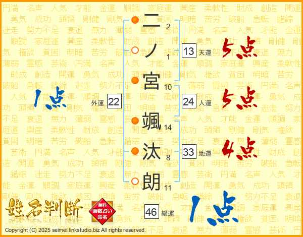 二ノ宮颯汰朗さんの総運は46画の1点!