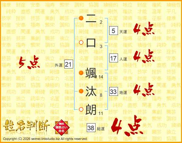 生活面を象徴する運勢です。外部から受ける影響力を表し、結婚運、家庭運や職場、環境への順応性を表します。総運から人運を引いた画数。姓や名が1文字の場合を除く。
