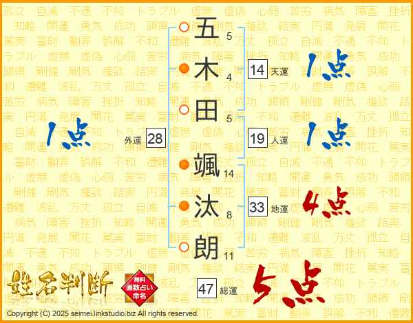 五(5画)木(4画)田(5画) 颯(14画)汰(8画)朗(11画)