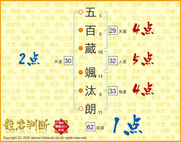 五(5画)百(6画)蔵(18画) 颯(14画)汰(8画)朗(11画)