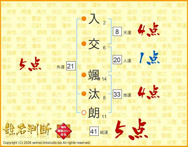 入(2画)交(6画) 颯(14画)汰(8画)朗(11画)