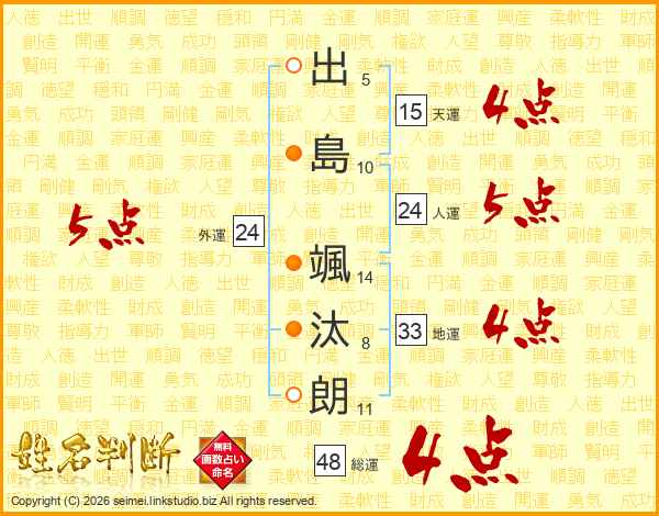 出(5画)島(10画) 颯(14画)汰(8画)朗(11画)