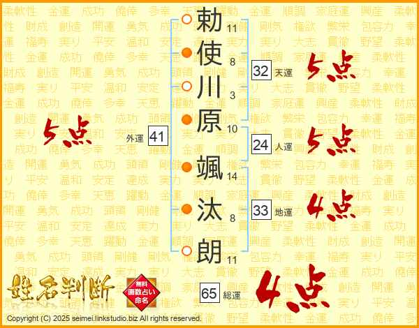 勅(11画)使(8画)川(3画)原(10画) 颯(14画)汰(8画)朗(11画)