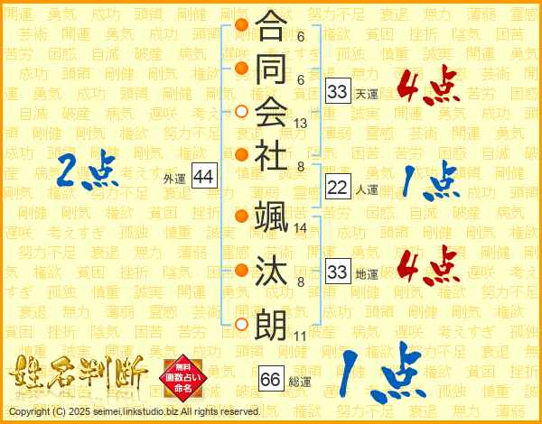 合(6画)同(6画)会(13画)社(8画) 颯(14画)汰(8画)朗(11画)