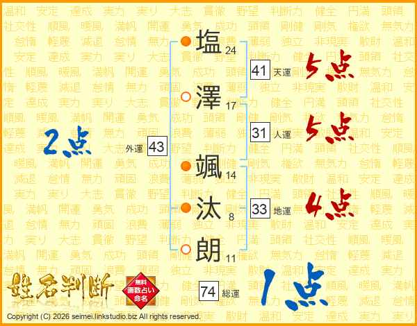 塩(24画)澤(17画) 颯(14画)汰(8画)朗(11画)